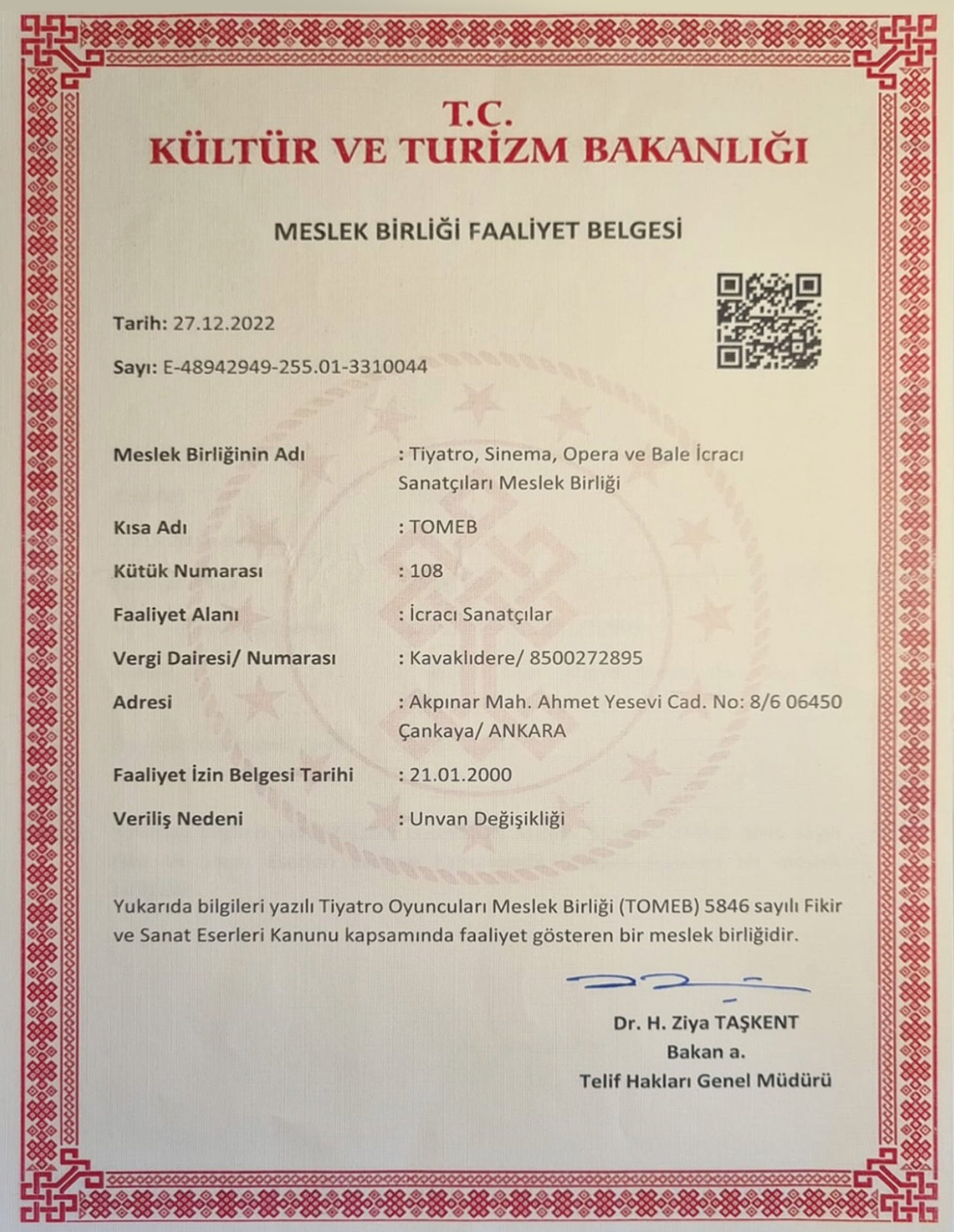 Tiyatro oyunculuğunun bir meslek olarak nitelikli ve iyi koşullarda icra edilmesini sağlamak, tiyatro oyuncularının ortak çıkarlarını korumak, haklarını İzlemek, tespit edilen İcraların izinsiz kullanımından doğan tazminat ile icraların kullanılmasından kaynaklanan gelirlerin tahsilini ve hak sahiplerine dağıtımını sağlamak amacıyla kurulmuş olan TOMEB (Tiyatro Oyuncuları Meslek Birliği) T.C. Kültür ve Turizm Bakanlığı 21 Ocak 2000 tarih ve 12 sayılı makam onayı İle tüzel kişiliğini kazandı.